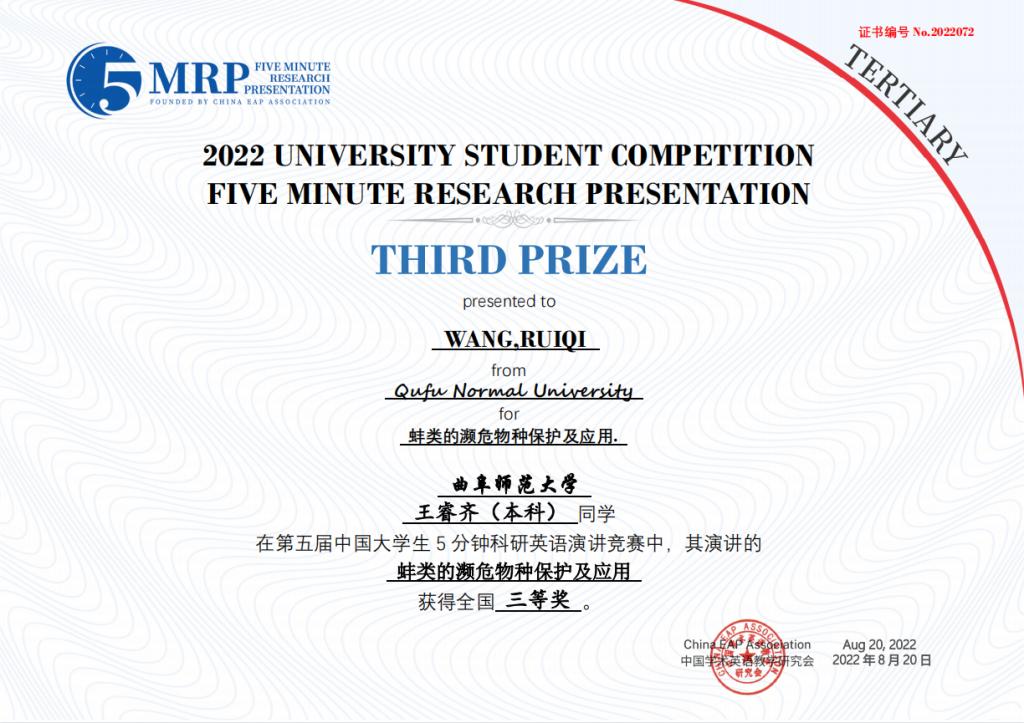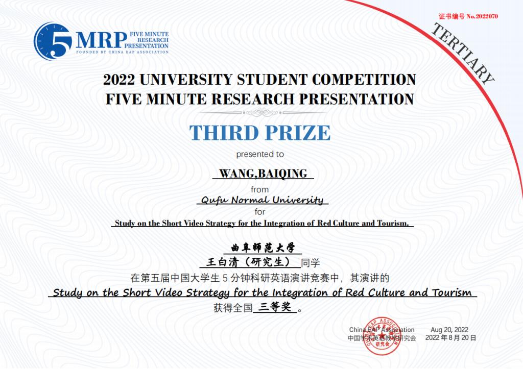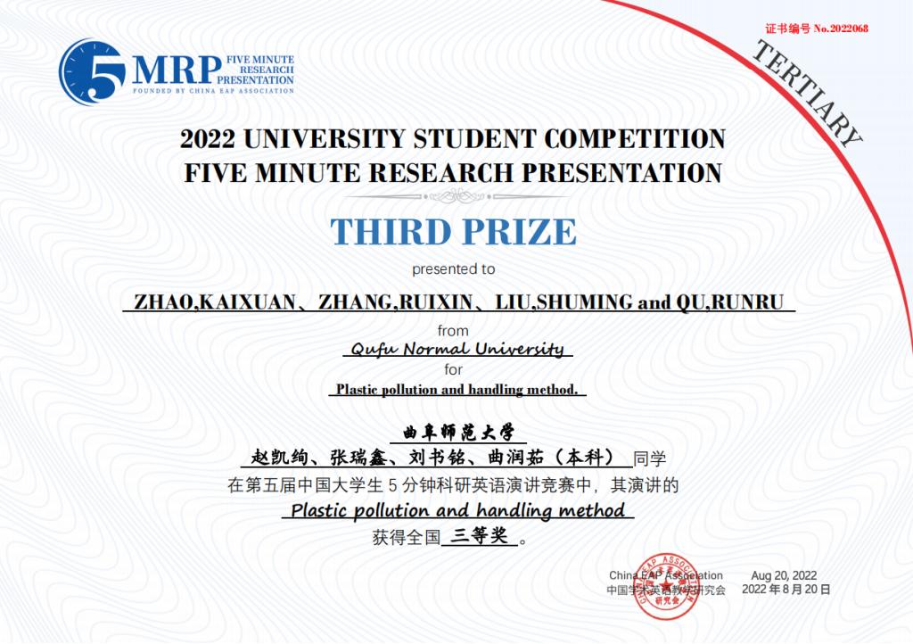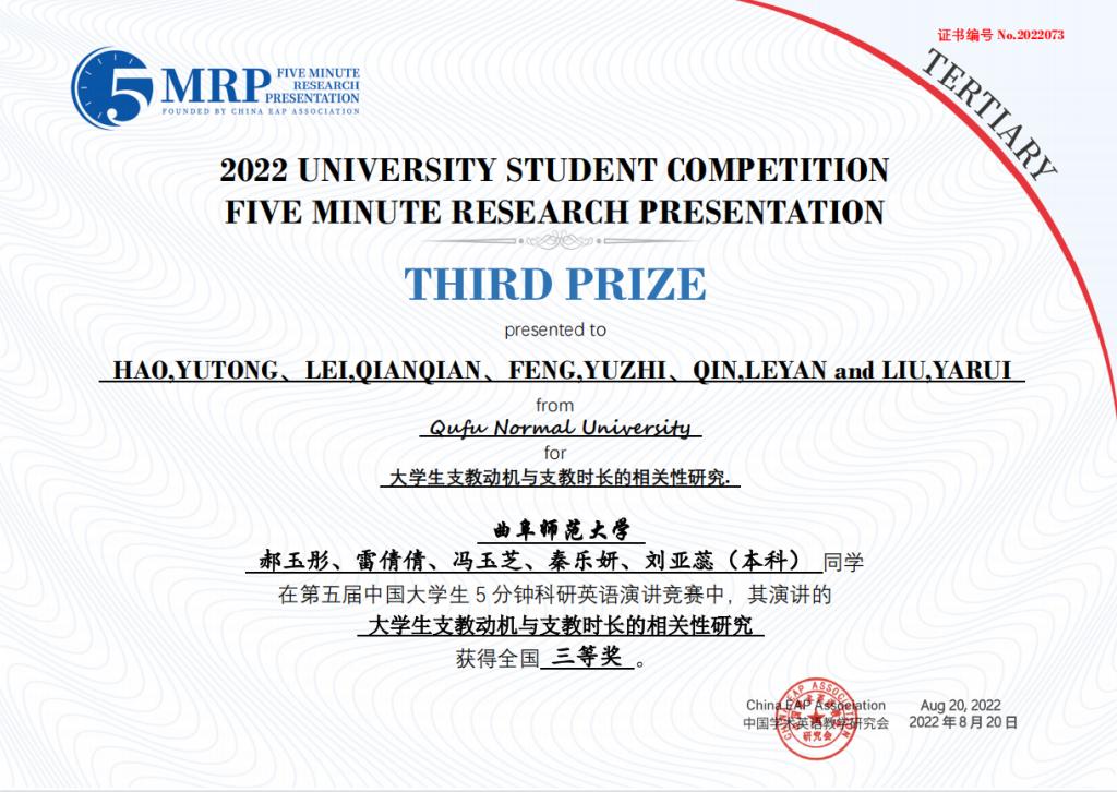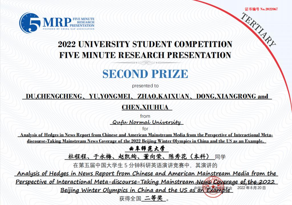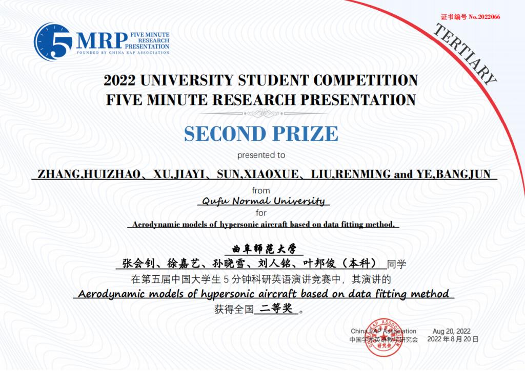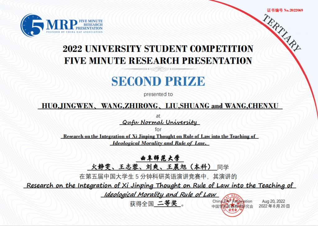 附2:第五届中国大学生五分钟科研英语演讲大赛B体育官网获奖团队获奖证书