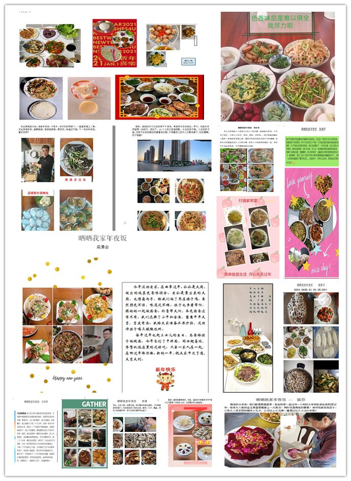 在2021年新春到来之际,我部推出“晒晒我家年夜饭”新春年夜饭征集评比活动。邀请全体教职工参加自家年夜饭的“招牌菜”评比,同时也把各类拿手菜品的制作方式、烹饪心得等和全体老师一起分享,共同传递新年的喜庆和祝福。本次征集活动目的是为了引领健康餐桌、文明餐桌的新风尚,激发教职工们对传统文化和风俗的热爱。