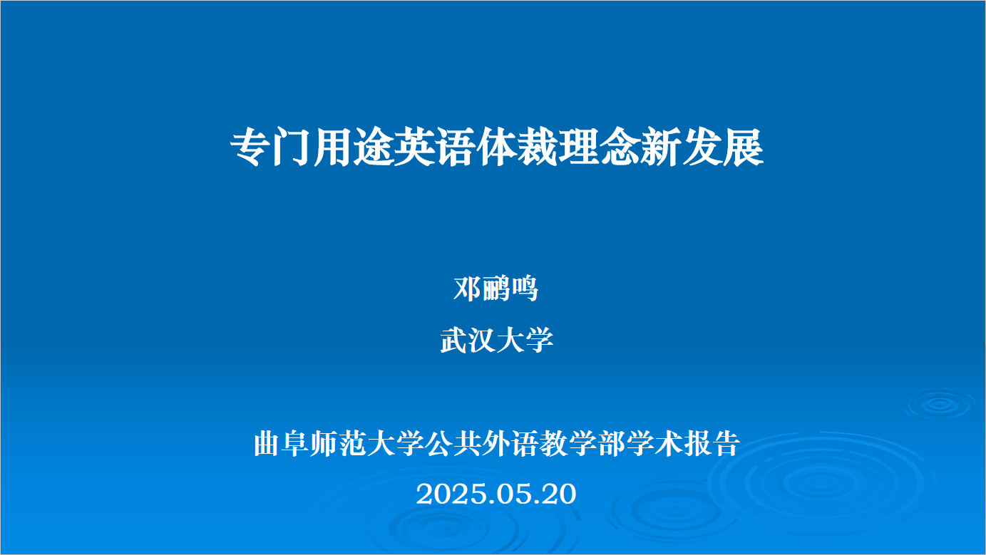 2025年5月20日下午,B体育官网B体育(中国)一站式服务官网举办70周年校庆系列学术活动暨博雅讲坛第八场。武汉大学邓鹂鸣教授应邀作题为“专门用途英语体裁理念新发展”的学术报告,B体育(中国)一站式服务官网全体教师参加活动。