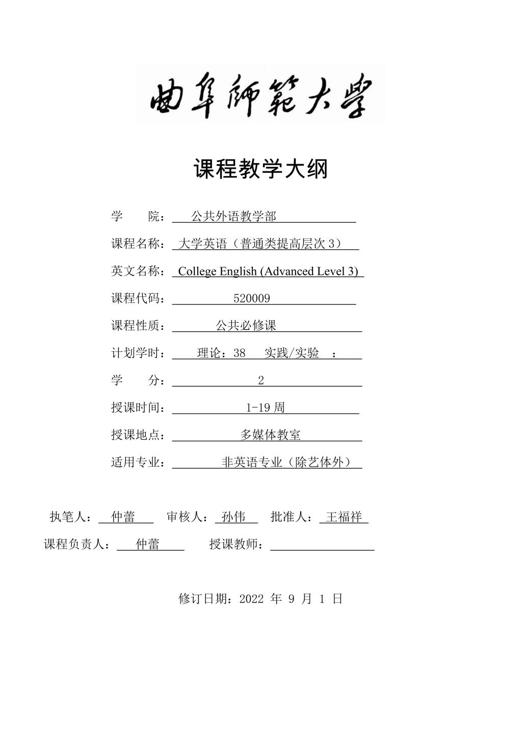 大学英语(普通类提高层次3)课程教学大纲(2022版)