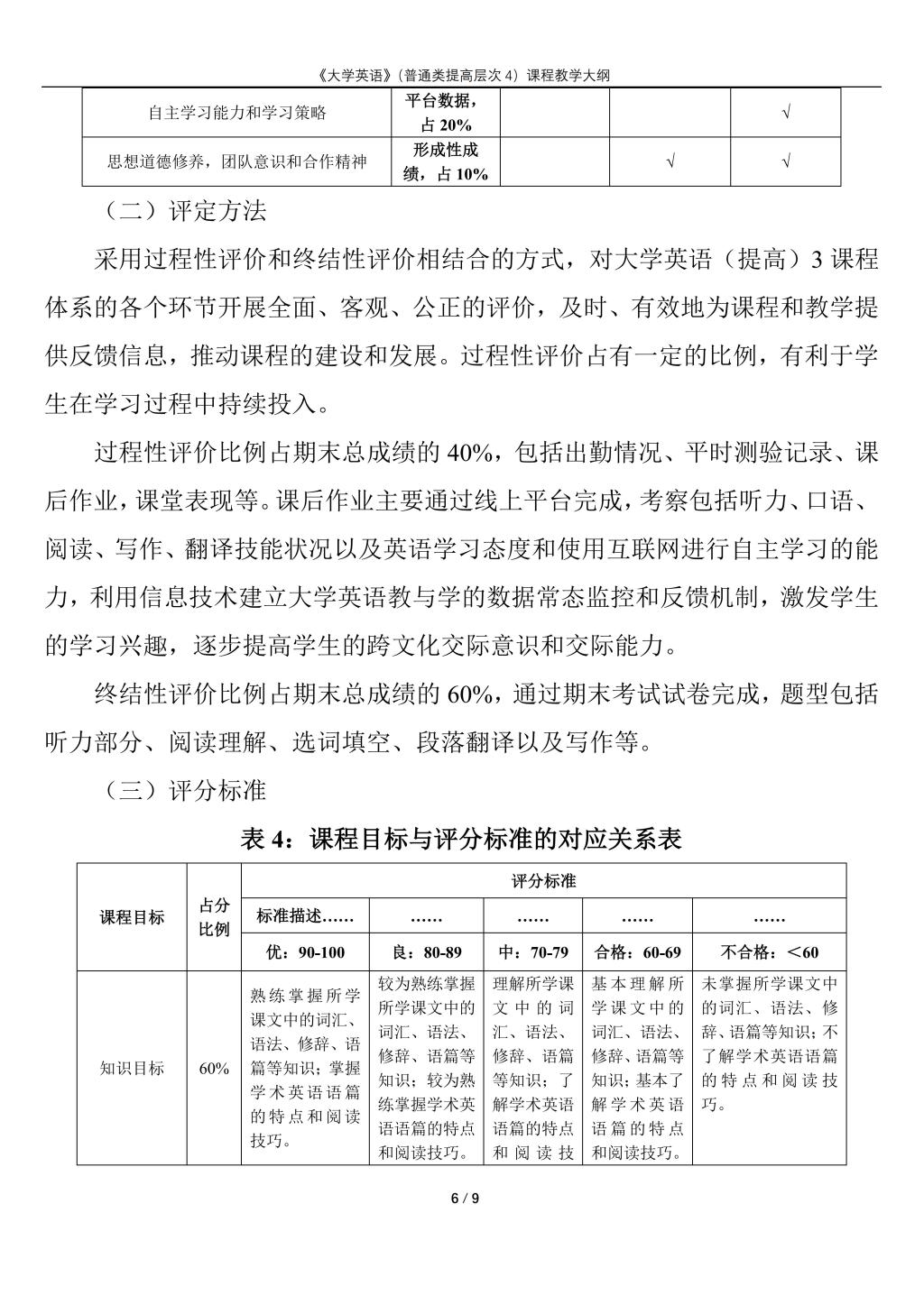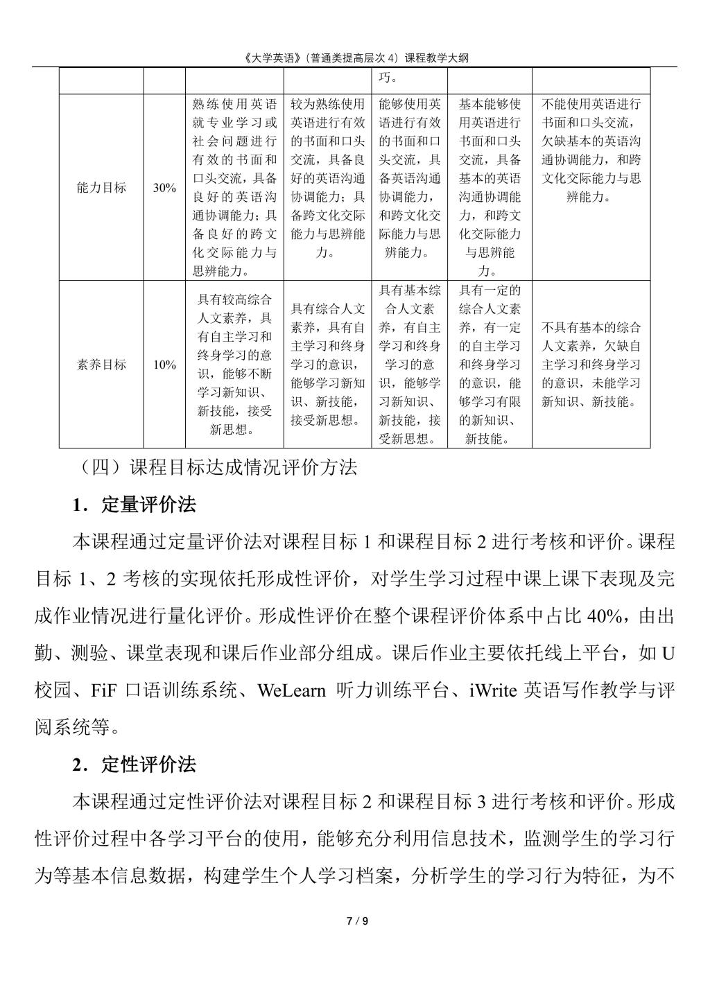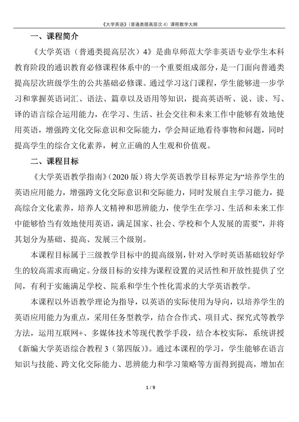 大学英语(普通类提高层次4)课程教学大纲(2022版)