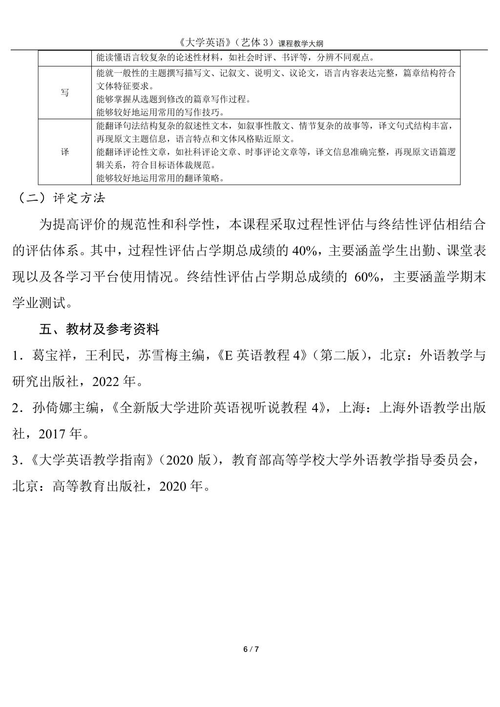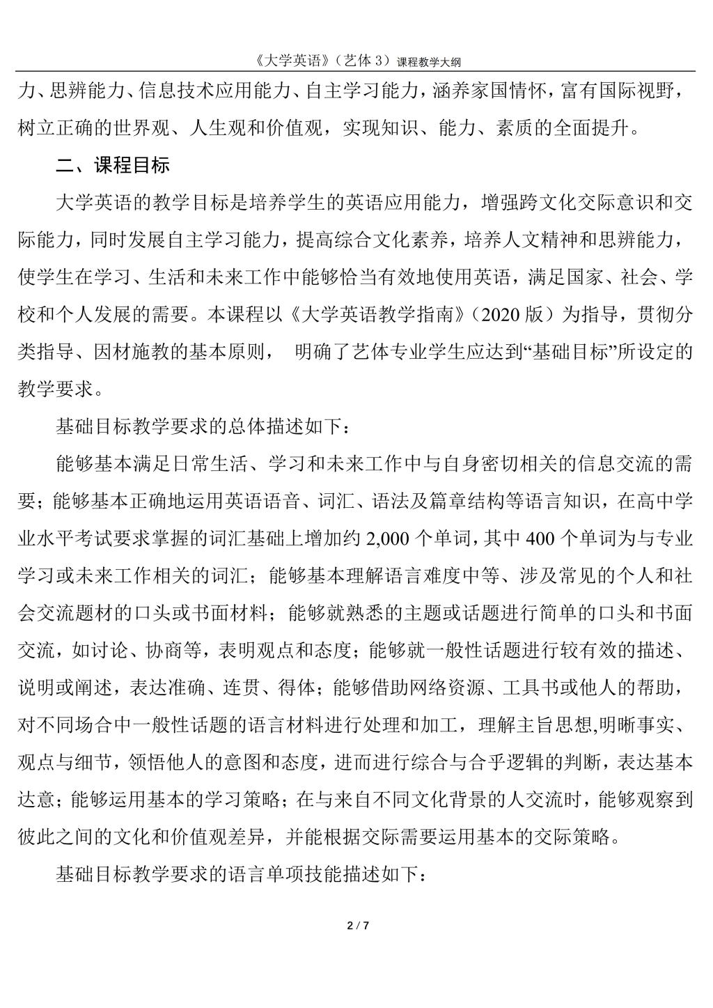 大学英语3(艺体)课程教学大纲(2022版)
