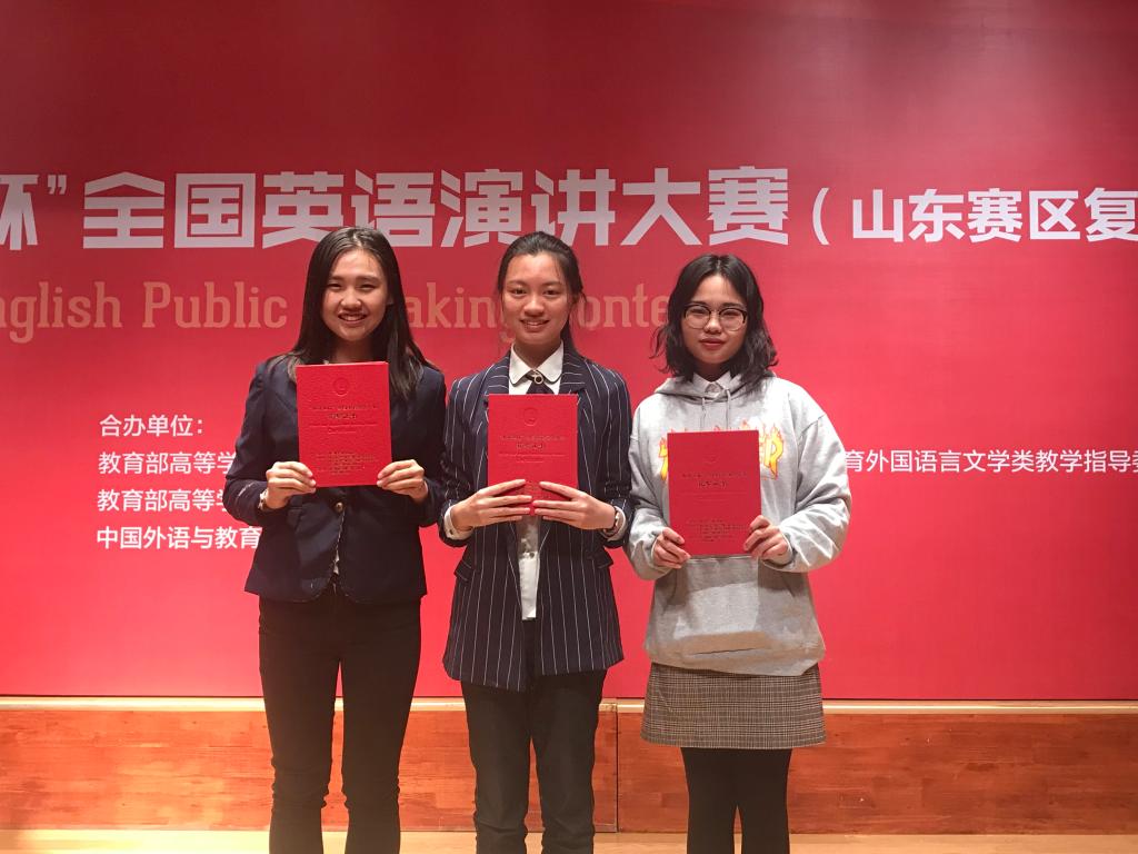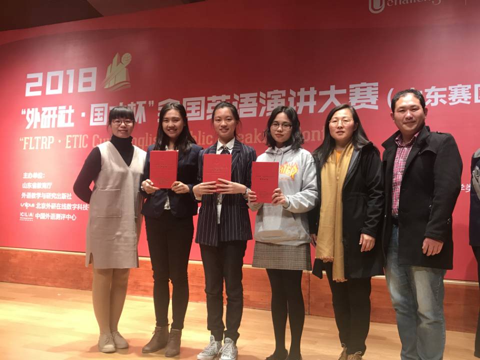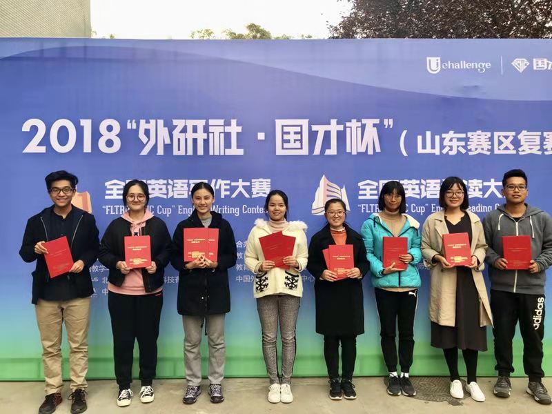 2018年11月3日-4日,2018“‘外研社杯’全国大学生英语挑战赛”山东赛区比赛在济南和烟台两地如期举行,此次比赛包括“‘外研社杯’全国英语阅读大赛”、“‘外研社杯’全国英语写作大赛”和“‘外研社杯’全国英语演讲大赛”三项赛事。B体育官网两校区的13名同学在我校衣进韬、孙海珊、满虎、徐欣、秦艳五位教师的带领下参加了本次比赛。经过激烈角逐,我校外国语学院徐欣老师指导的葛宇飞和B体育(中国)一站式服务官网齐荣军老师指导的宗宇翔两位同学荣获阅读大赛一等奖,衣进韬老师指导的路璨雯同学荣获阅读大赛二等奖,王燕老师指导的杨春和孙伟老师指导的宋纯嘉两位同学荣获阅读大赛三等奖。张英老师指导的刘涵同学荣获写作大赛二等奖,彭芳老师指导的成晓宁和王显明老师指导的李洛璞两位同学荣获写作大赛三等奖,秦艳老师指导的张朕和门超元老师指导的储文沁两位同学荣获写作大赛优胜奖。另外,满虎老师指导的刘珂含同学荣获演讲大赛二等奖,孙伟老师指导的周先敏同学荣获演讲大赛三等奖,孙海珊老师指导的张涵俐同学荣获演讲大赛优秀奖。
