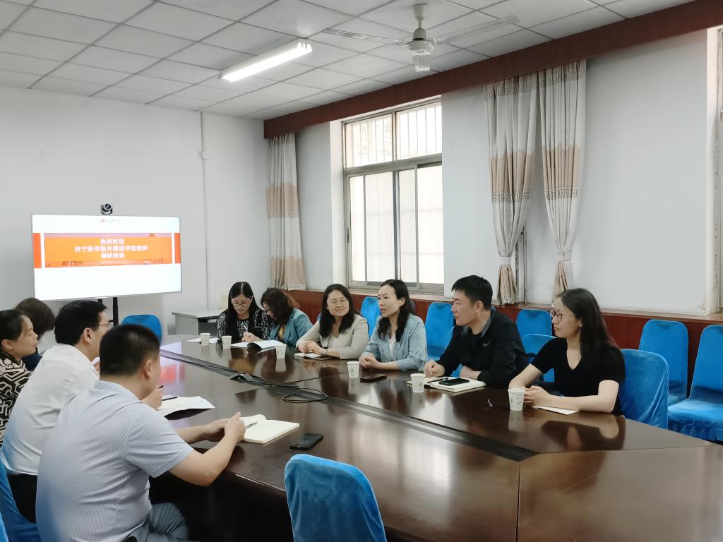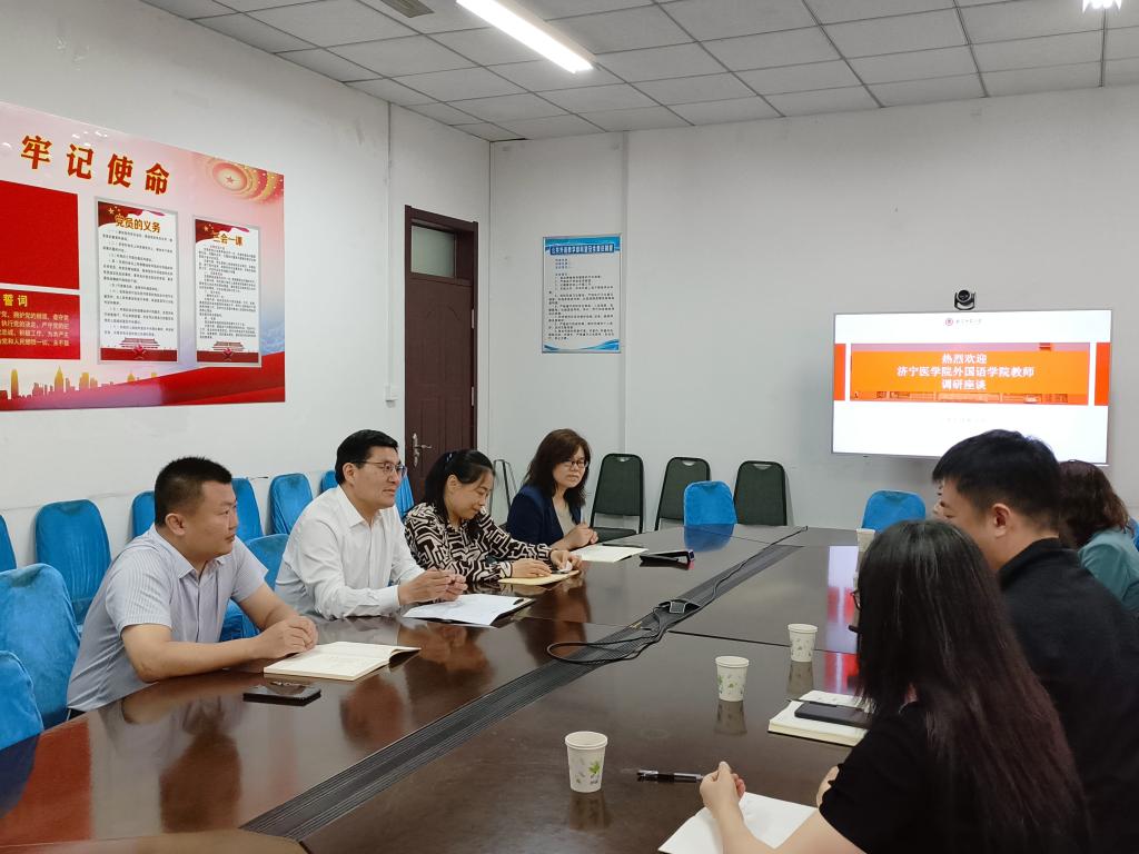 6月1日,济宁医学院外国语学院院长朱敏教授一行来我部考察交流。陪同考察的有学院副书记史飞、副院长褚宏蕊,以及综合科、教研室相关负责人张洁、崔运君、司梦老师。B体育官网B体育(中国)一站式服务官网主任王福祥、副主任王显明亲切接待了来访客人。教研室主任杜明真、仲蕾一同参加了交流座谈会。