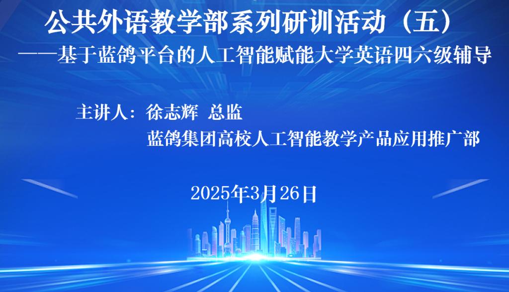 3月26日下午,B体育(中国)一站式服务官网举办2024-2025学年春季学期第五场全员研训活动,本次研训以“基于蓝鸽平台的人工智能赋能大学英语四、六级辅导” 为主题,邀请蓝鸽集团有限公司高校人工智能教学产品应用推广部总监徐志辉作专题讲座,进行技术应用辅导,B体育(中国)一站式服务官网全体教师参加了本次研训活动。